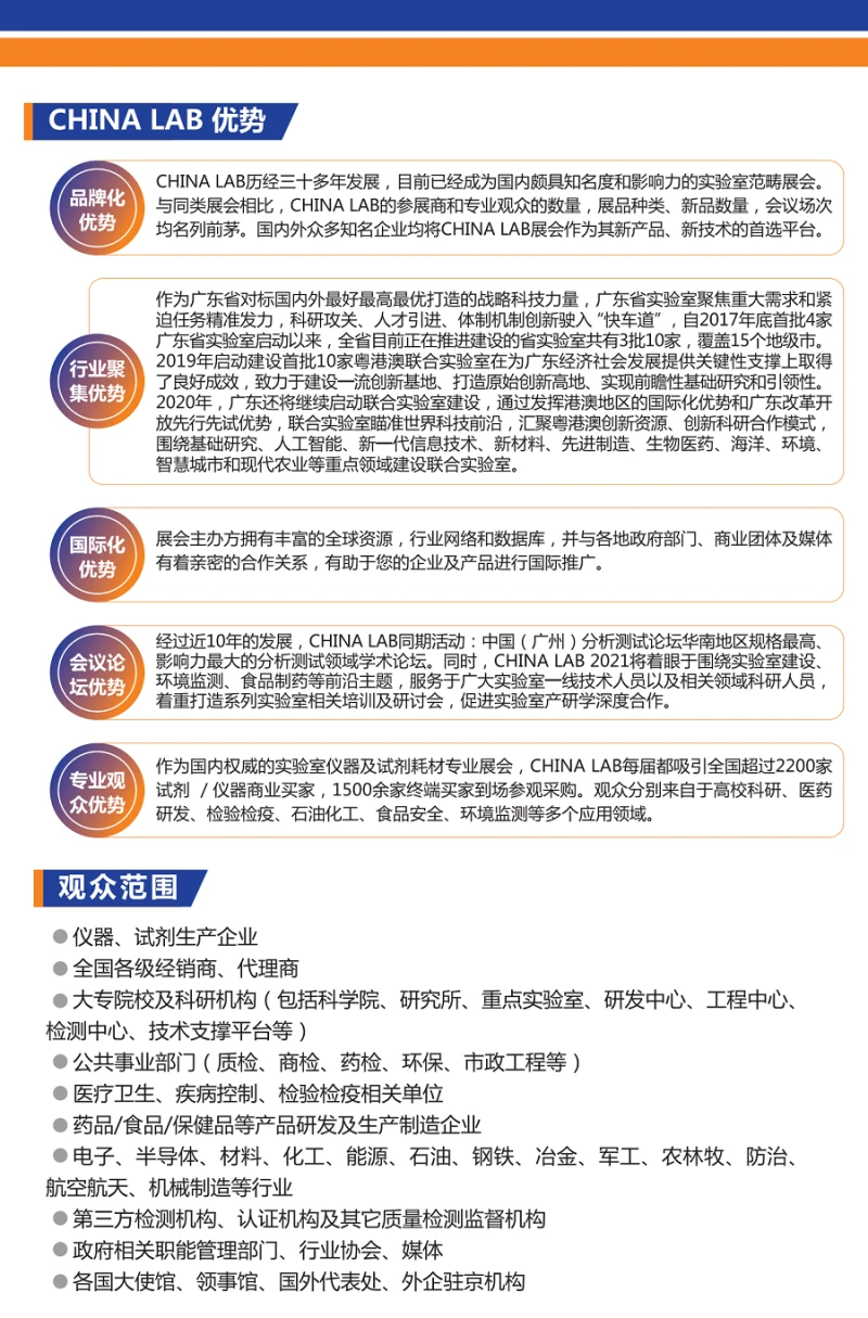 Die Guangzhou International Analytical Testing and Laboratory Equipment Exhibition (CHINA LAB) deckt die gesamte Wertschöpfungskette der Labortechnik und -ausstattung ab. Mit Sitz in Südchina ist sie in ganz China und Südostasien aktiv. Im Mittelpunkt stehen Laborinstrumente, -geräte, Reagenzien und Verbrauchsmaterialien. Darüber hinaus bietet sie umfassende Lösungen für Labore – von der Planung und dem Bau über den Betrieb bis hin zu Software, Management und Investitionen. Durch Ausstellungen und Foren dient die CHINA LAB als interaktive Plattform für Fachleute der Laborbranche zum Austausch, zur Förderung von Innovationen und zum Lernen und präsentiert Komplettlösungen für Labore.